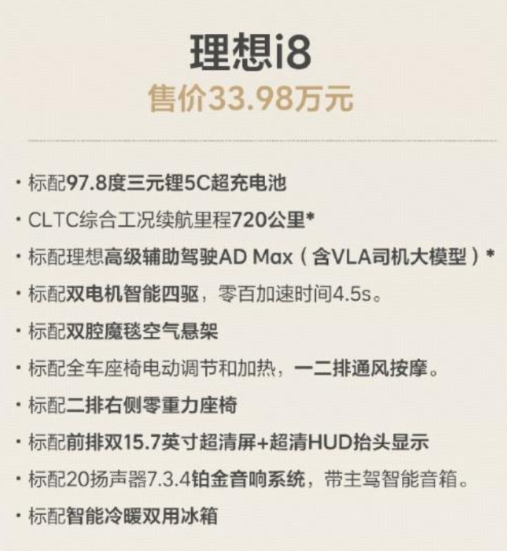 动力系统上,新理想i8基于800V高压平台打造,全系搭载双电机四驱系统,前感应/异步电机最大功率150kW,后永磁/同步电机最大功率250kW,系统综合功率400kW,零百加速仅需4.5秒。在续航方面,新车提供两种电池容量版本,Pro版搭载容量为90.1kWh的电池,CLTC续航里程为670km;Max和Ultra版搭载容量为97.8kWh的电池,CLTC续航里程可达720公里 ,配合5C超充技术,10分钟即可补充500公里续航。感兴趣的可以多加关注,后续将会持续更新。